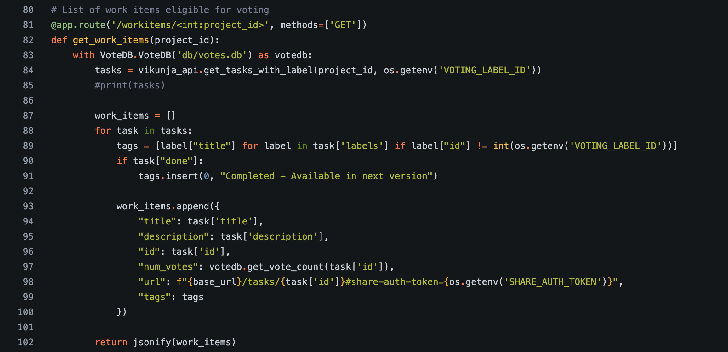 - When the user asks for the list of vote-able work items, it queries the Vikunja server for those “vote”-tagged tasks and fetches the current vote counts from the database.
