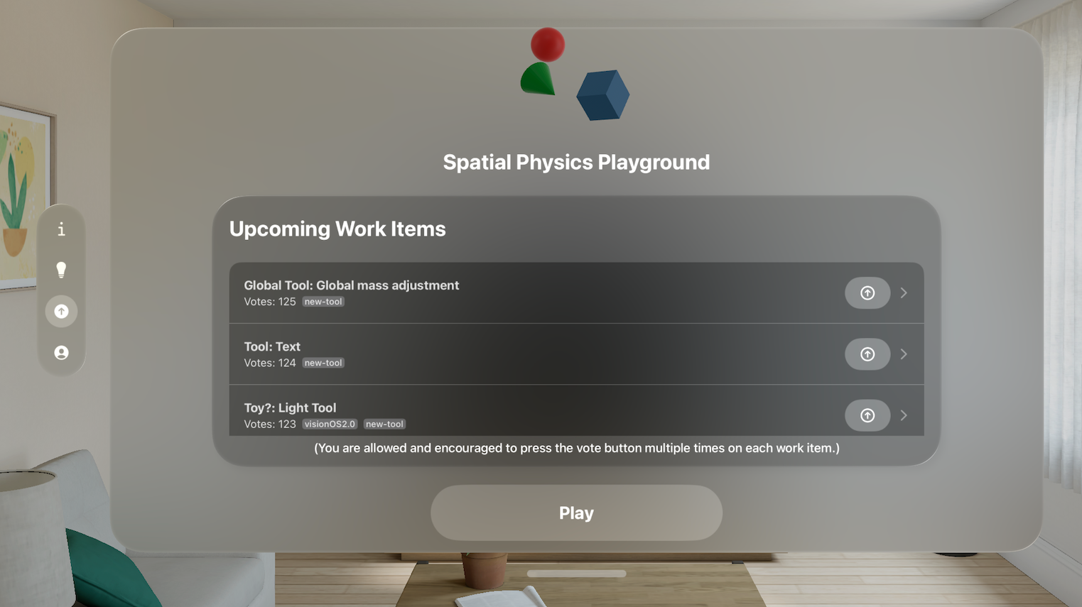 In my apps, I usually have a dedicated menu to display the list of vote-able work items. This list contains the work item title as well as a description and its current number of votes. And finally, the most important part, a button to increase the vote count.
