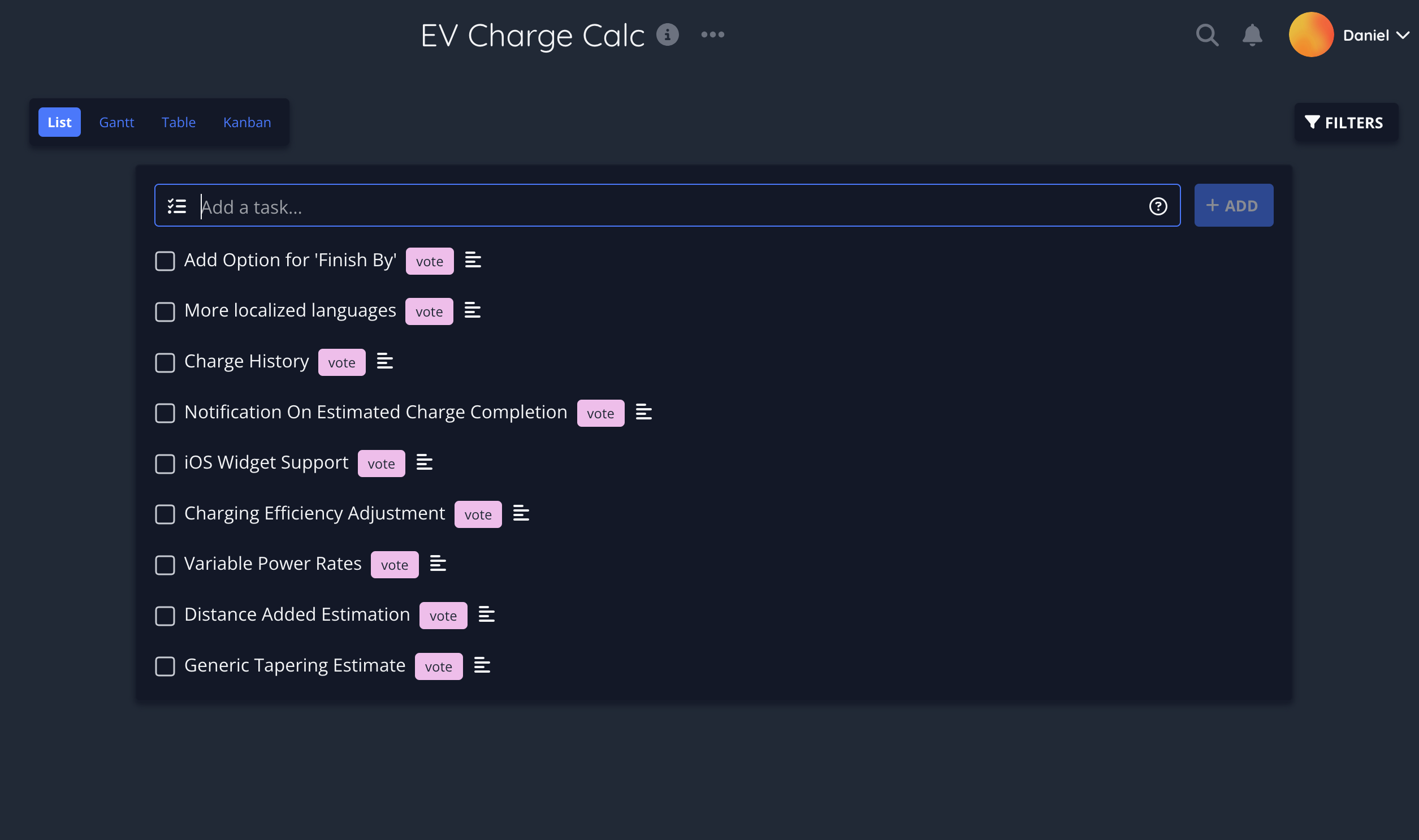 To manage this, I used a new tag assigned to tasks called “vote”. Descriptions are also used to provide additional information that can’t be contained by the limited title space.