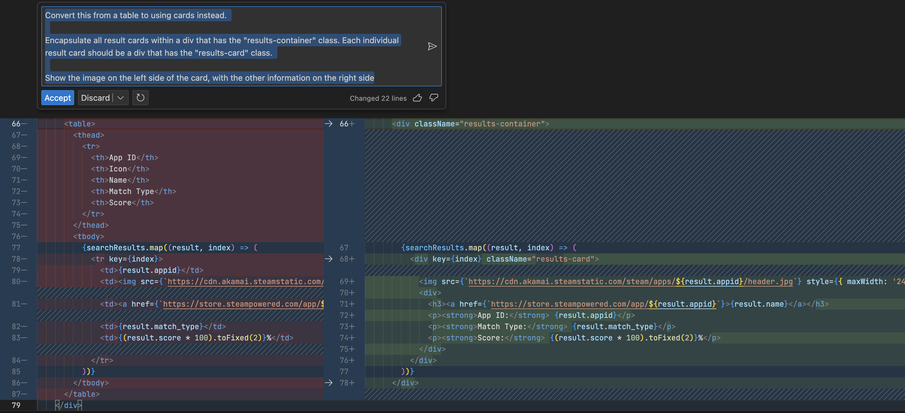 Larger revisions to the code were done the same way. I asked the GPT-vision model how I might make my app look less like a prototype, and it suggested I use result cards instead of a table. So I went back and asked Copilot to convert my table into cards.