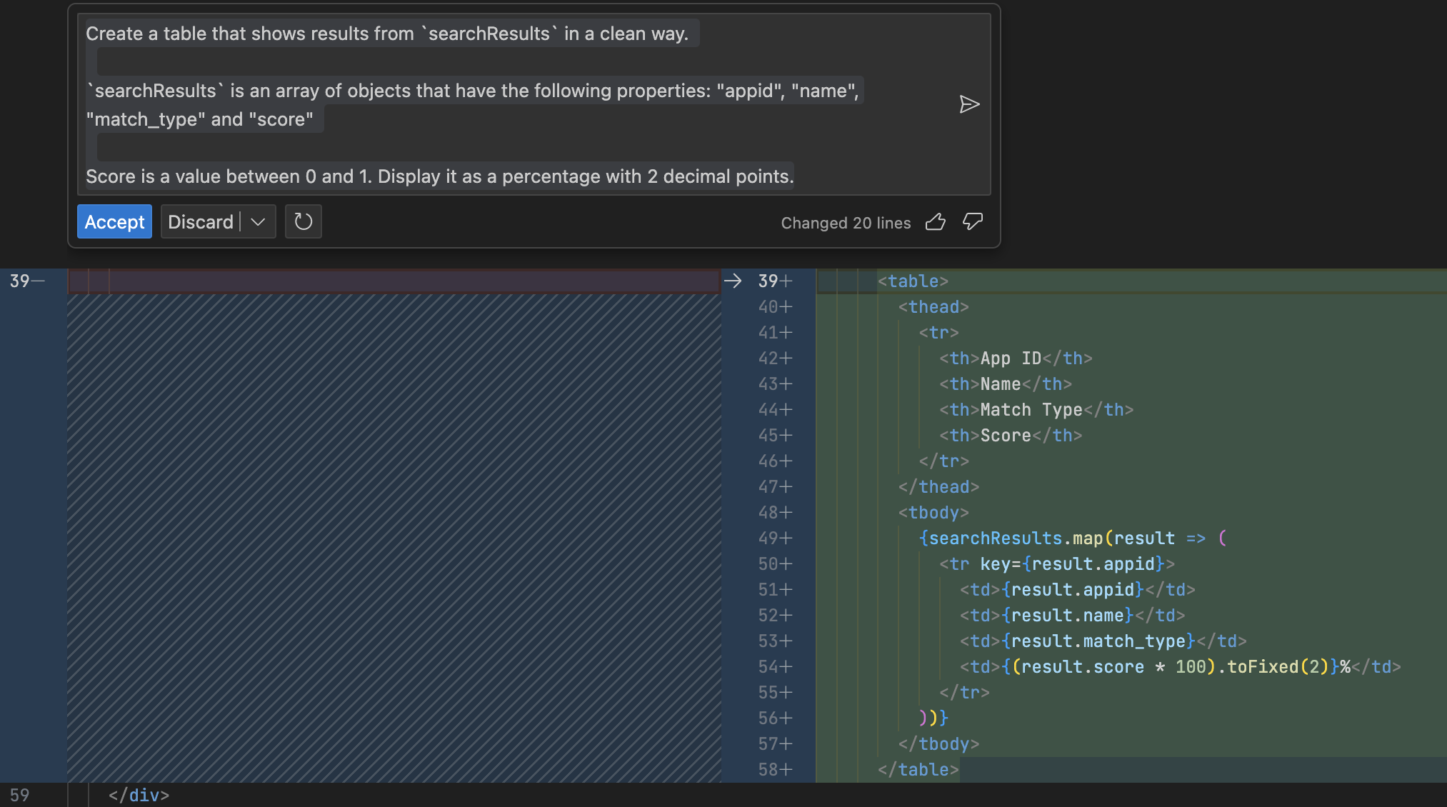 This is how development proceeded for most of the app. I would ask Copilot to generate the first draft of a component, then I would modify it to suit my needs or fix things that Copilot got wrong.