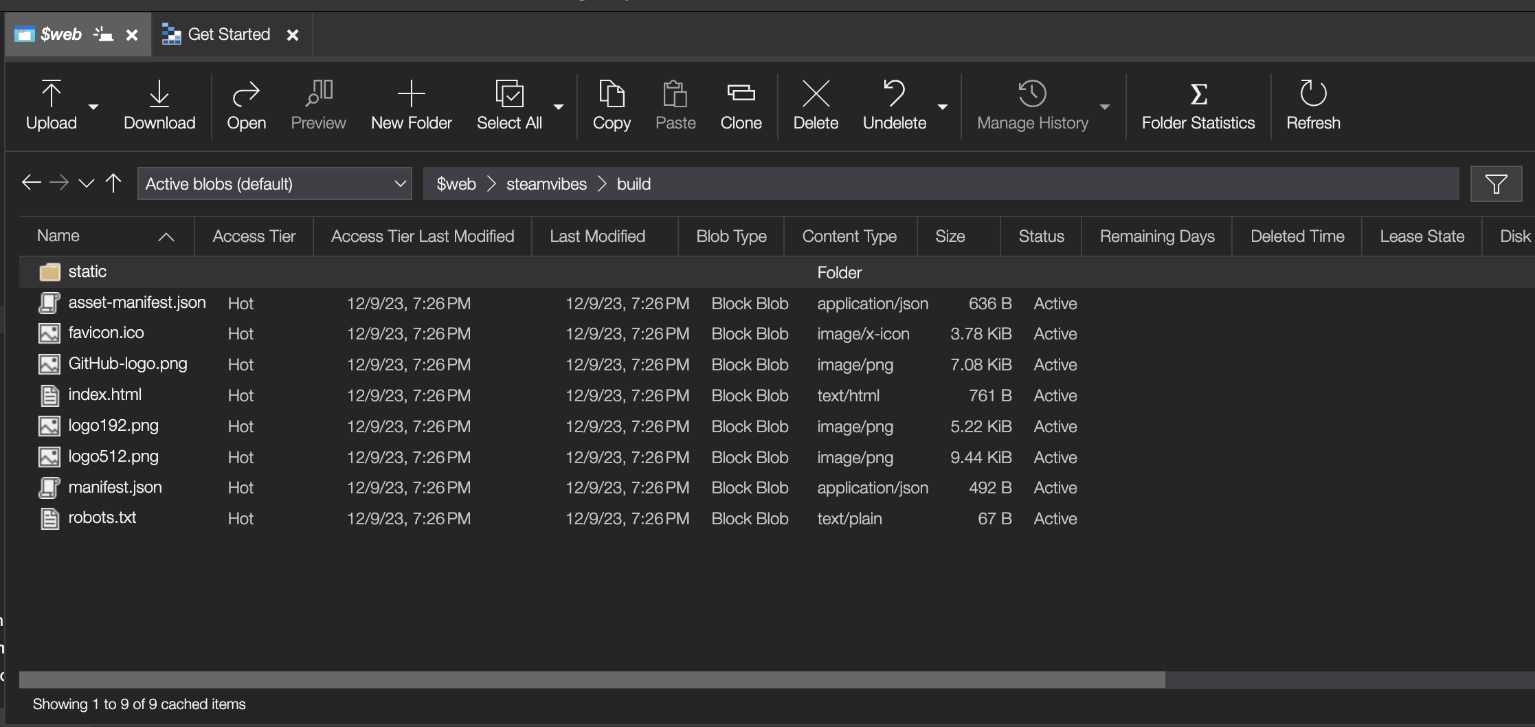 After running npm run build to generate the static site, I uploaded the contents of the build folder to a steamvibes subdirectory in the $web container (“steamvibes” being kind of like a codename for the project).