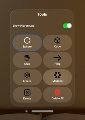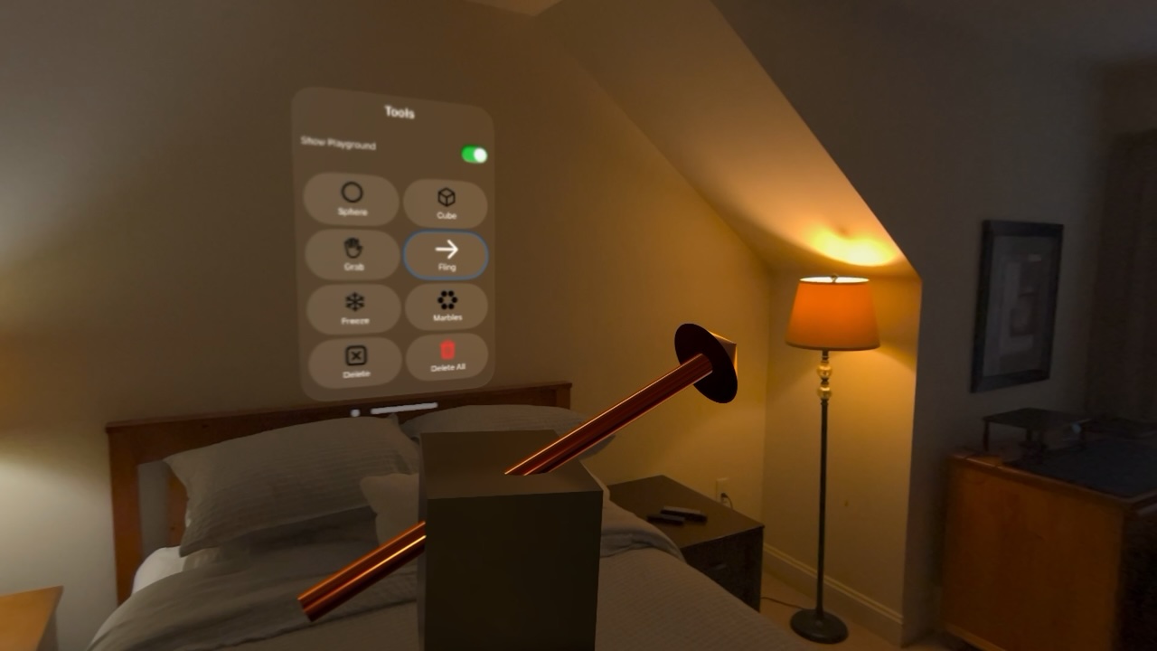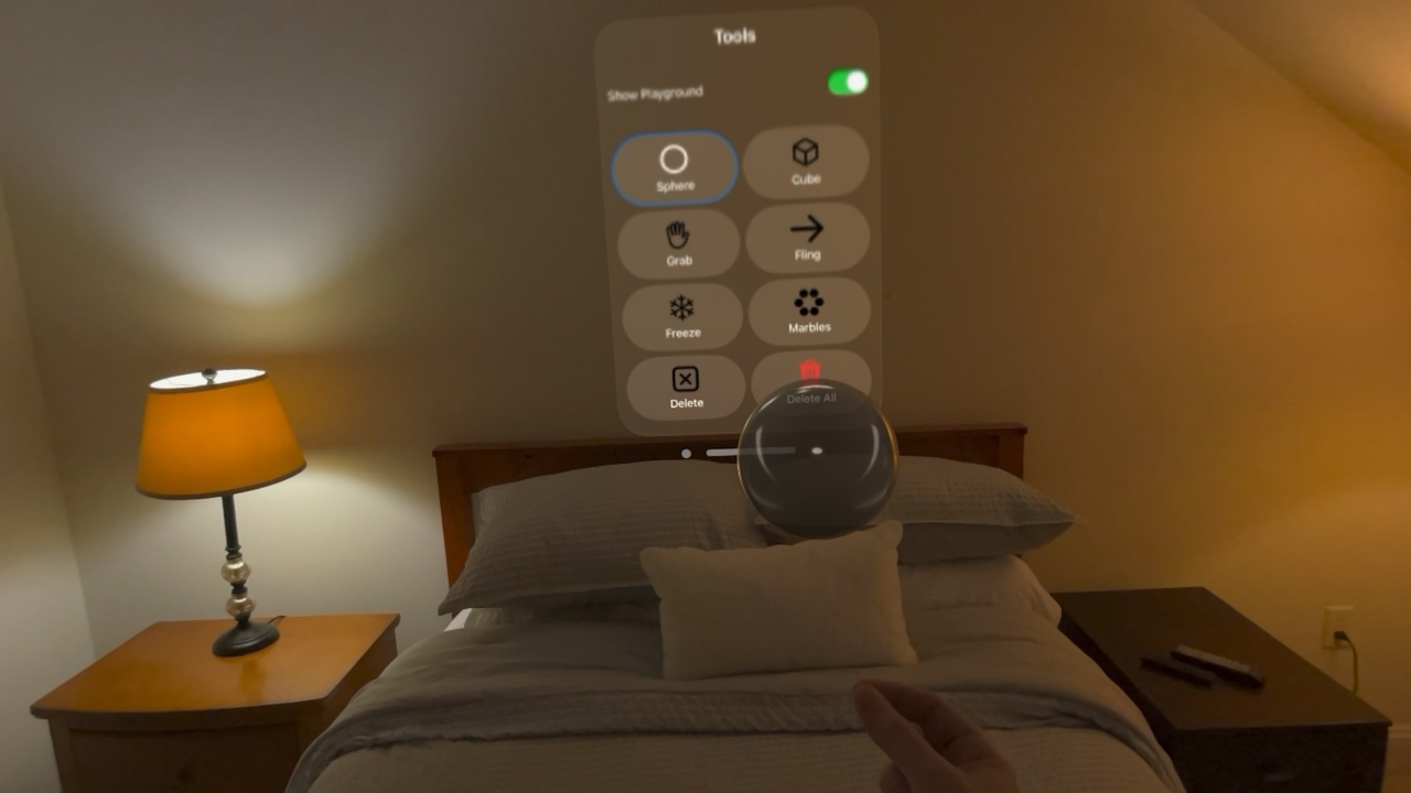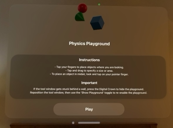 Spatial Physics Playground is a simple app for the Vision Pro. It’s a physics sandbox where you can create objects and interact with them in your physical environment. Using Apple’s RealityKit, the objects you create can collide with each other and the real world.