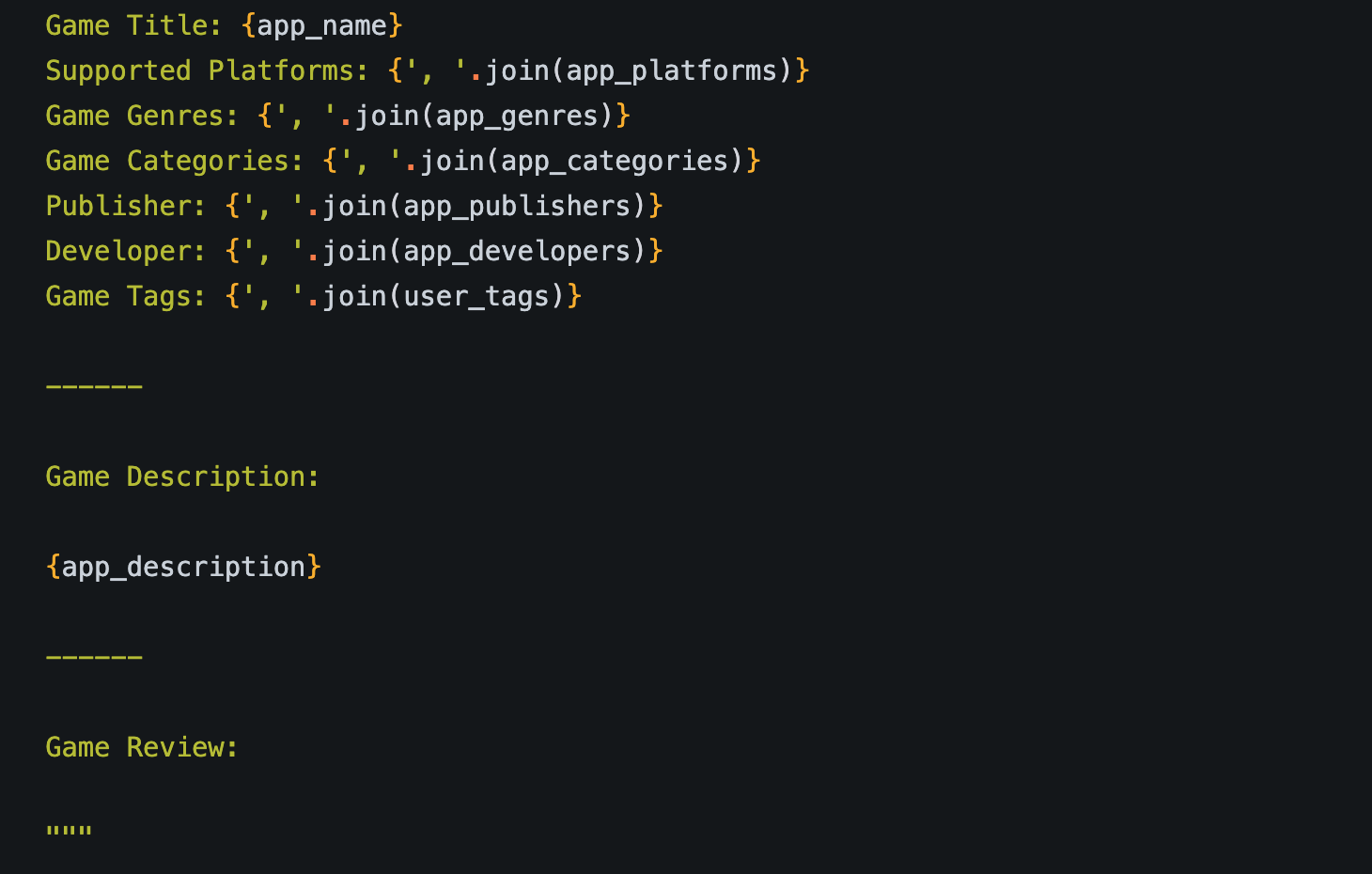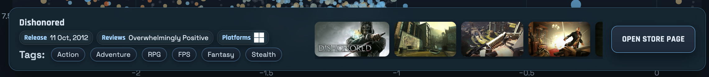 And finally, I wanted a way to show the list of community-assigned tags associated with a game on Steam. That was a larger problem, as it turns out Steam Game Tags are not listed anywhere in the Steam Store API. The solution to this required using a library: GitHub - ValvePython/steam, which mimics a real Steam client to issue requests to Valve’s servers. Apparently this is the only way to know the community-assigned tags for a game on Steam.