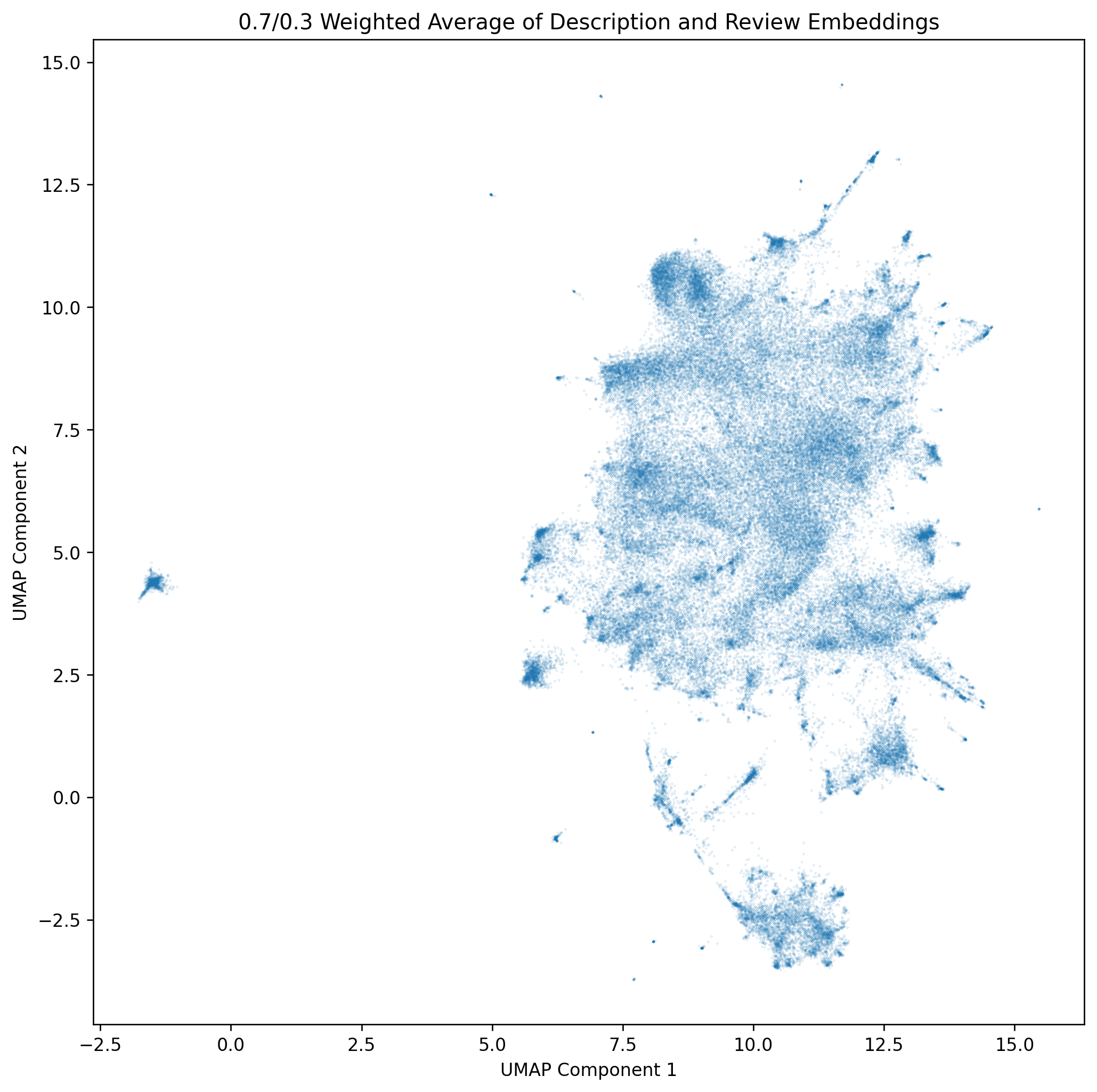 I also played around with how I ‘merged’ reviews for a given game. Originally, because of the small context, reviews were embedded individually. Then those embeddings were later combined using math (mean pooling, basically averaging them).