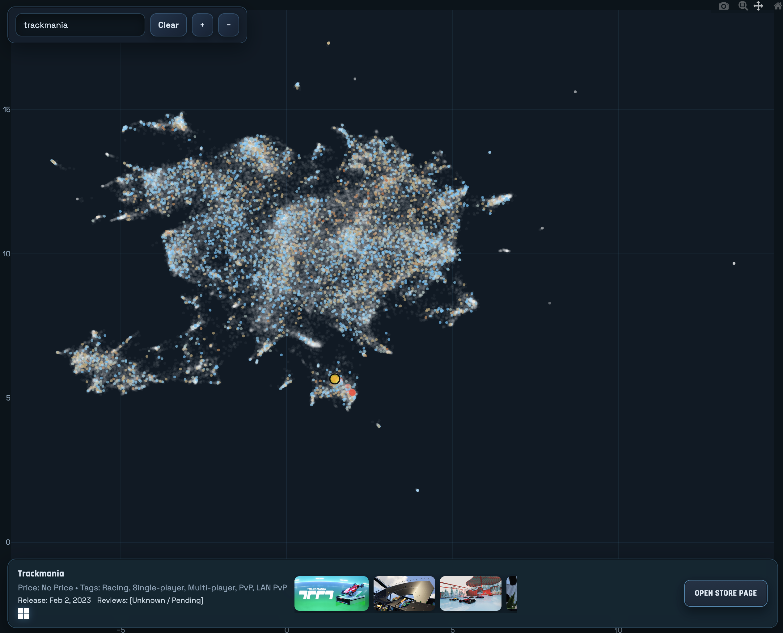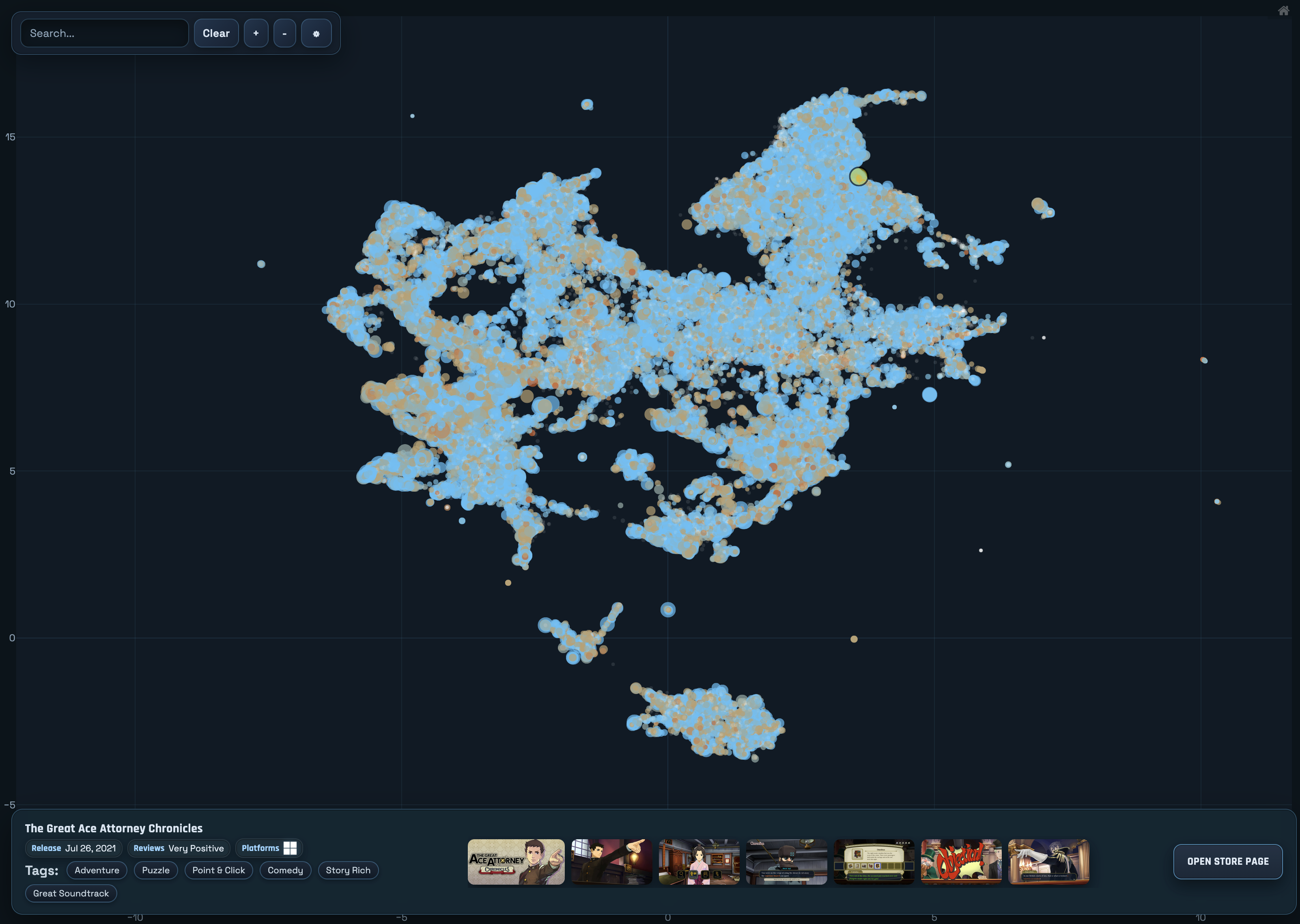 The final step is to plot these points visually on a map so that people can look at them. The image above is nice and all, but wouldn’t it be nice if you could know what game is behind each point on that map?
